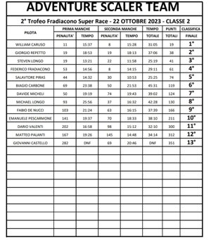 Il 2° Trofeo Fradiacono Super Race con ben 60 porte ha visto 13 piloti darsi battaglia. Tra questi ha avuto la meglioed è salito sul gradino più alto del podio William Caruso. Bravo Will!! Il gazebo retrattile te lo sei proprio meritato. Al 2° posto, sempre più agguerrito, Giorgio Repetto mentre al 3° posto si conferma un ottimo pilota Steven Longo. 4° un felicissimo e sempre più bravo bravo Federico Fradiacono. A seguire dietro di lui Salvatore Piras, Biagio Carbone e davide Micheli che con pazienza e concentrazione migliorano costantemente le loro prestzioni. Michael Longo oggi non cappotta (per fortuna) e si posiziona 8°. 9° Fabio de Nucci, 10° Emanuele Pescarmone e 11° Dario Valenti che alla loro prima gara AST accusano il percorso fettucciato.... ragazzi vi rifarete alla prossima. Matteo Palanti 12° e 13° Giovanni Castello che dimentica di avvitare un dado al mezzo e perde una ruota nel tracciato di gara...peccato. Per concludere voglio ringraziare Tutti i partecipanti perchè è Grazie a Voi se l'AST può dare la possibilità di divertirsi Tutti insieme.